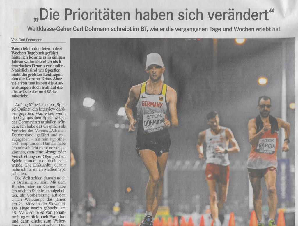 Aumattstadion abgeriegelt, Hallen gesperrt, Leichtathletik-Training eingestellt. In einem BT-Artikel (BT 28. März 2020 „Die Prioritäten haben sich verändert“) beschreibt SCL Heel Race-Walker und Olympia-Geher Carl Dohmann die Situation: Seit meiner Rückkehr aus Südafrika trainiere ich jeden Tag ein bisschen, aber ohne Plan und Ziel. Das werde ich zunächst auch weiter so tun“. Jeden Tag etwas Sport, um der Isolation seiner kleinen Wohnung in Freiburg zu entgehen. Irgendwann, das weiß auch Carl Dohmann, wird es wieder Wettkämpfe geben und dann muss er seine Motivation wieder finden. Die Verlegung der Olympischen Spiele um ein Jahr findet er angesichts der dramatischen Situation in Ordnung.