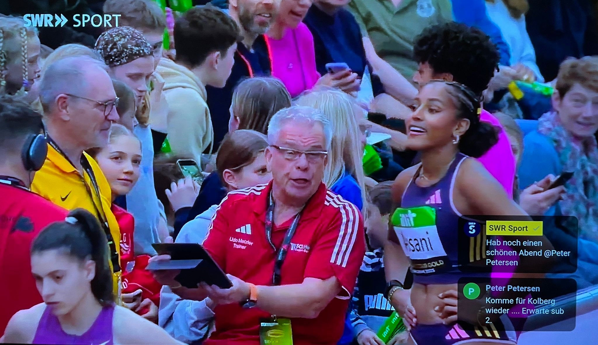 Nachdem bei den Versuchen 3-5 Mikaelle bei ihren Weiten von 6,51m / 6,64m und 6,46m etwas zu lange Schritte vor dem Absprung gemacht und damit einfach zu passiv agiert hatte, ging das Duo Assani/Metzler dann volles Risiko – der Coach schickte Mikaelle im Anlauf eine Fuß nach vorne und das passte. Besser kann man den Sprung nicht auf´s Brett bringen – haarscharf gesetzt wurden 6,79m gemessen. Das war Platz 2 in diesem Int. Meeting und ein Fingerzeig darauf, dass es beim ISTAF in Berlin am Freitag und bei der DM kommende Woche spannend werden dürfte.