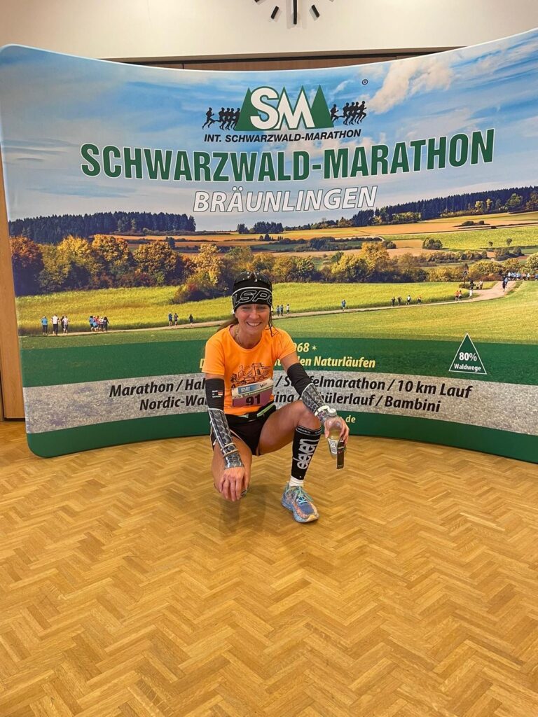 Es war ein Kampf gegen den Krampf – am Ende hat es sich gelohnt zu kämpfen: Birgit Marzluf W55 hatte harte Kilometer beim Bräunlinger Halbmarathon zu überstehen. Der rechte Oberschenkel verhärtete sich. „Ich dachte, ich komme den Berg nicht mehr runter“, sagte sie im Ziel. „Aber auf den letzten drei Kilometern haben sich die Verspannungen gelöst“. Die letzten drei wichtigen Kilometer vor dem Ziel konnte Birgit nochmal durchziehen und sich auf Rang 2 etablieren (1:55,01 Stunden). Der Bräunlinger Halbmarathon gilt gleichzeitig als Baden-Württembergische Meisterschaft über die 21,0975 Kilometer. Silber zum Saisonabschluss ist noch einmal ein grandioser Erfolg für die sehr erfolgreiche Langläuferin, die in diesem Jahr schon die Landestitel über 800 und 1500 Meter in der Klasse W55 gewonnen hat. In der Klasse W30 zeigte Silvia Cormaci ein starkes Rennen. Die Race-Walkerin wird zunehmend auch im Lauf erfolgreicher und kam nach 1:38,02 Stunden ins Ziel und belegte den dritten Platz in ihrer Altersklasse. In diesem Jahr hatte sie schon eine Halbmarathon-Zeit von 1:34,57 Stunden. Der Bräunlinger Lauf gilt mit seinen viele Steigungen und Höhenmetern als besonders anspruchsvoll.