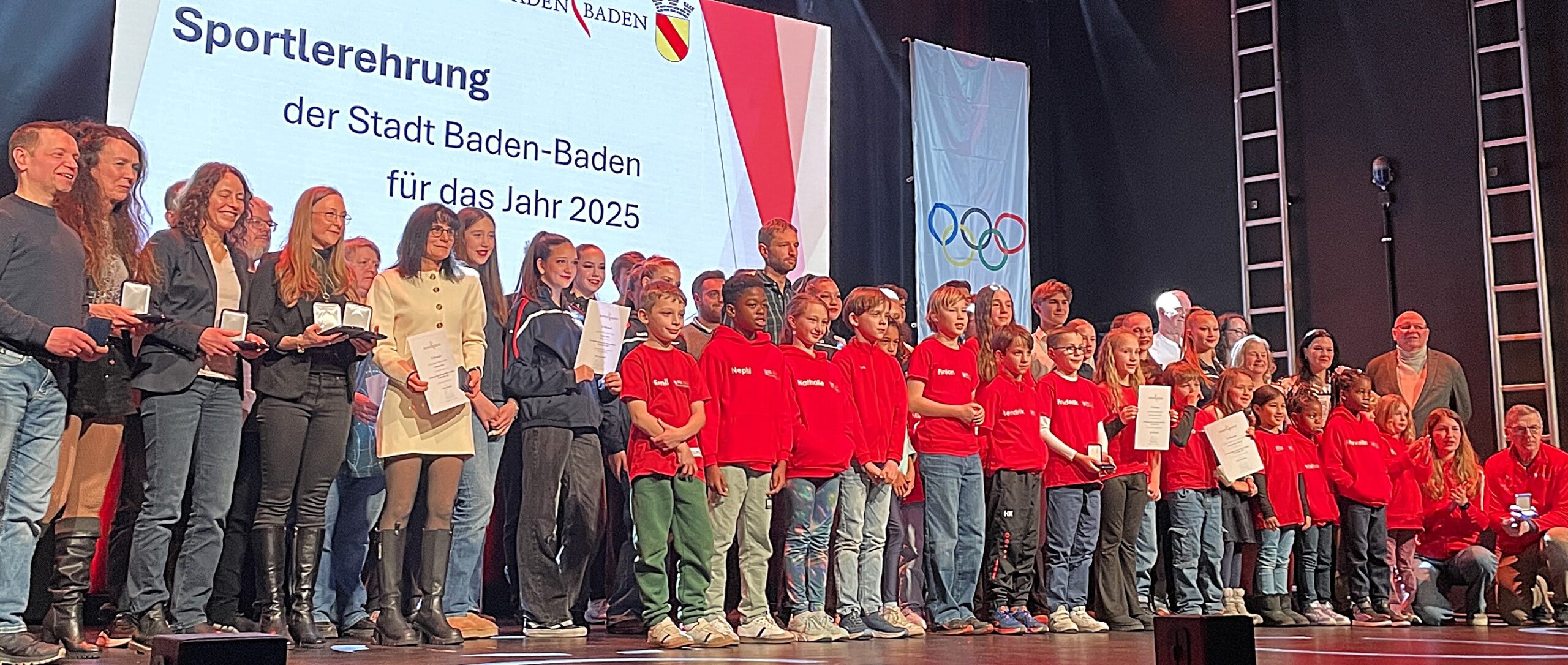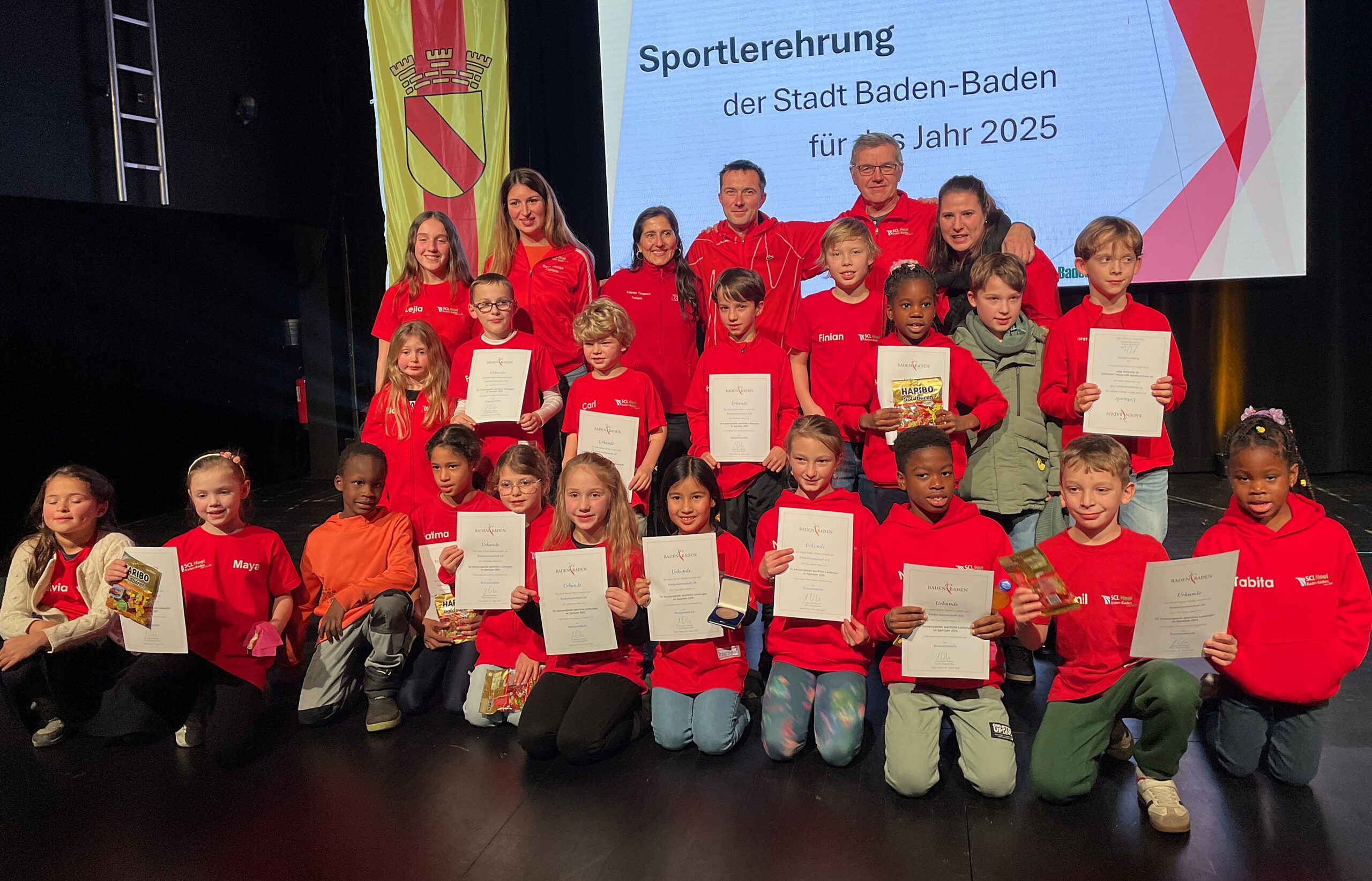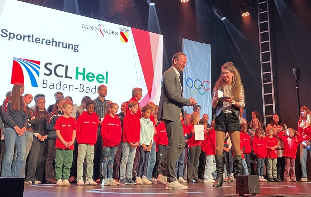 Neben einer schicken Trophäe gab es für das Team einen Scheck der Sparkasse. Zuvor wurden die drei SCL Heel Damen bereits für ihren DM-Sieg mit der Goldmedaille der Stadt ausgezeichnet. Die Mannschaft des Jahres wird unter allen erfolgreichen städtischen Teams vom Sportausschuss ausgewählt. Neben der Team-Wertung gab es für die SCL Heel Athletinnen und Athleten weitere Medaillen für erfolgreiche Meisterschafts-Platzierungen. Carl Dohmann gewann Silber für seinen zweiten Platz bei der DM im 35 km Gehen. Weitere Silbermedaillen gab es für Susanne Graf (BW Meisterin 800 Meter), Elke Wagner (BW Hallenmeisterin 800 Meter) und Birgit Marzluf (BW Meisterin 800 Meter).Bronzemedaillen für zweite bzw. dritte Plätze bei Landesmeisterschaften erhielten Nicole Bauer-Köhler und Olexiy Klychko. Bunt wurde es, als die beiden SCL Heel Kinder-Teams für Siege beim Baden-Finale in der Kinder-Leichtathletik geehrt wurden und alle in ihren roten Jacken auf der Bühne standen. Dem U8 Team gehörten Leo Schütze, Adam Batmaz, Merveille Wowoi, Carl Schulde, Oskar Schnepf, Bezawit Atanaw Ayele, Maya Osipova, Jaison Khamba, Tu Anh Nguyen, Olivia Esser, Ela Alarcin an. Für das U10 Team kämpften Nikola Piwowarska, Medina Mazreku, Fatima Lee, Nathalie Schleh, Nephi Bosal, Frederik Hölzle, Luis Abrar, Emil Aliamkin, Hendrik Kett, Finian Firchau, Oskar Gediehn. (Fotos (8): Bernd Hefter)