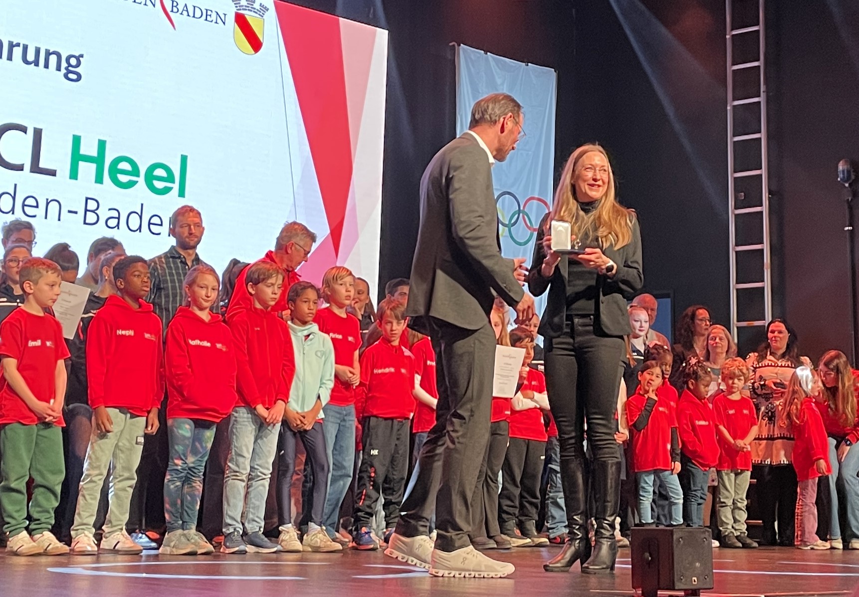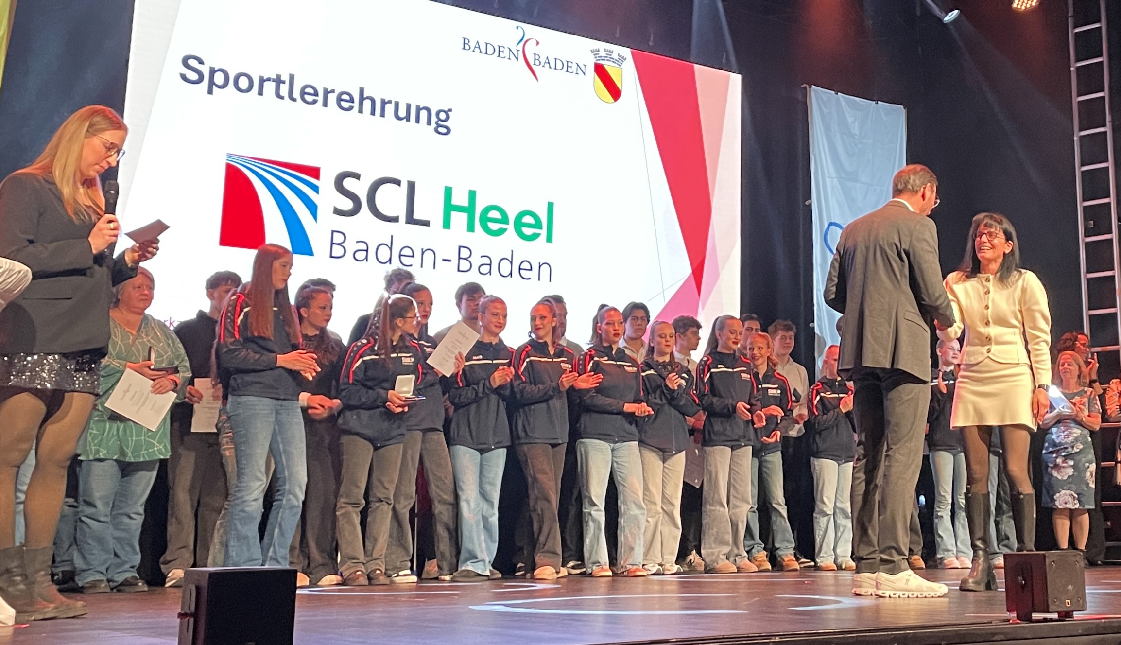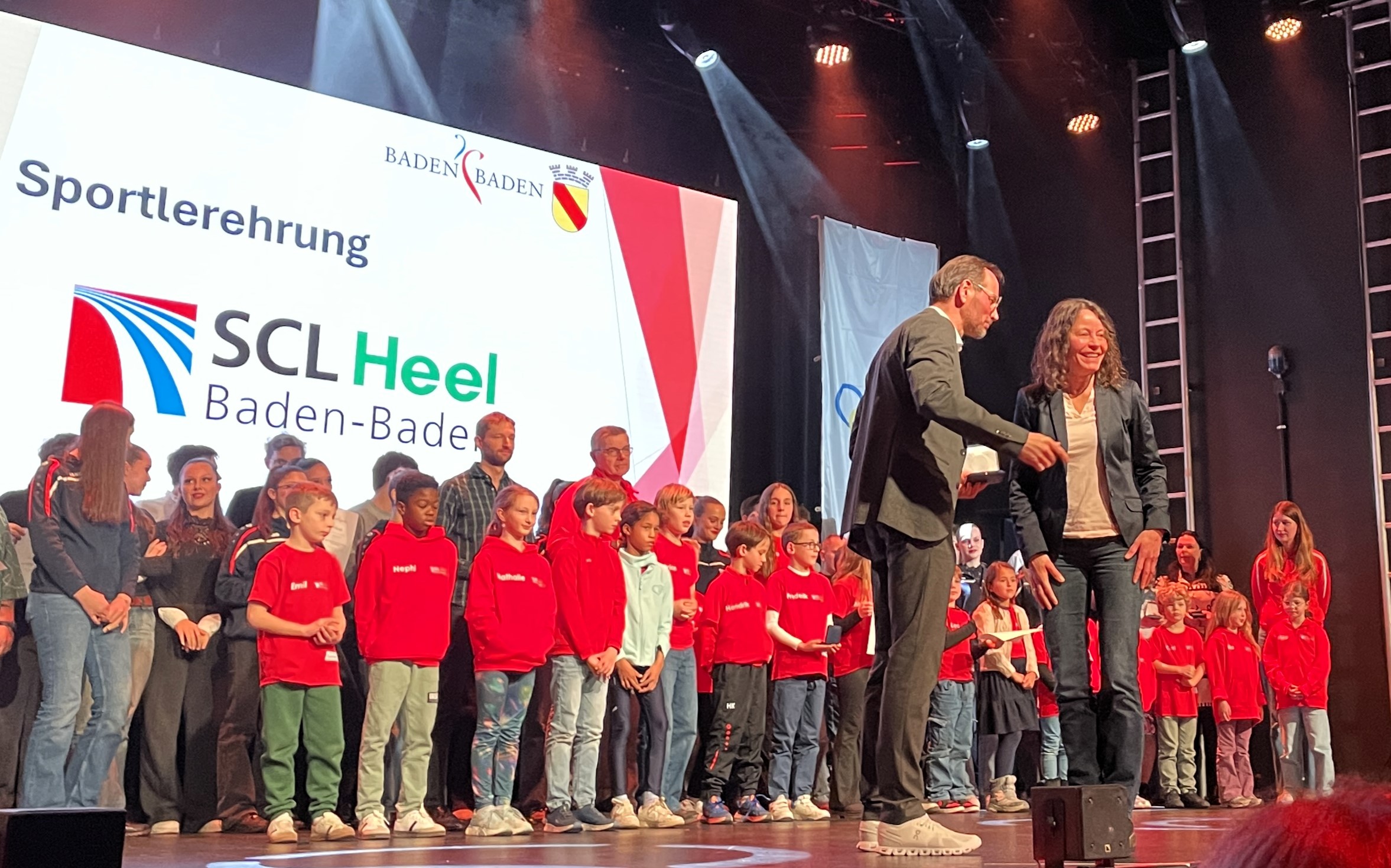 Neben einer schicken Trophäe gab es für das Team einen Scheck der Sparkasse. Zuvor wurden die drei SCL Heel Damen bereits für ihren DM-Sieg mit der Goldmedaille der Stadt ausgezeichnet. Die Mannschaft des Jahres wird unter allen erfolgreichen städtischen Teams vom Sportausschuss ausgewählt. Neben der Team-Wertung gab es für die SCL Heel Athletinnen und Athleten weitere Medaillen für erfolgreiche Meisterschafts-Platzierungen. Carl Dohmann gewann Silber für seinen zweiten Platz bei der DM im 35 km Gehen. Weitere Silbermedaillen gab es für Susanne Graf (BW Meisterin 800 Meter), Elke Wagner (BW Hallenmeisterin 800 Meter) und Birgit Marzluf (BW Meisterin 800 Meter).Bronzemedaillen für zweite bzw. dritte Plätze bei Landesmeisterschaften erhielten Nicole Bauer-Köhler und Olexiy Klychko. Bunt wurde es, als die beiden SCL Heel Kinder-Teams für Siege beim Baden-Finale in der Kinder-Leichtathletik geehrt wurden und alle in ihren roten Jacken auf der Bühne standen. Dem U8 Team gehörten Leo Schütze, Adam Batmaz, Merveille Wowoi, Carl Schulde, Oskar Schnepf, Bezawit Atanaw Ayele, Maya Osipova, Jaison Khamba, Tu Anh Nguyen, Olivia Esser, Ela Alarcin an. Für das U10 Team kämpften Nikola Piwowarska, Medina Mazreku, Fatima Lee, Nathalie Schleh, Nephi Bosal, Frederik Hölzle, Luis Abrar, Emil Aliamkin, Hendrik Kett, Finian Firchau, Oskar Gediehn. (Fotos (8): Bernd Hefter)